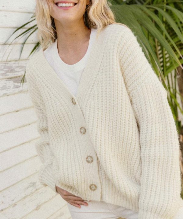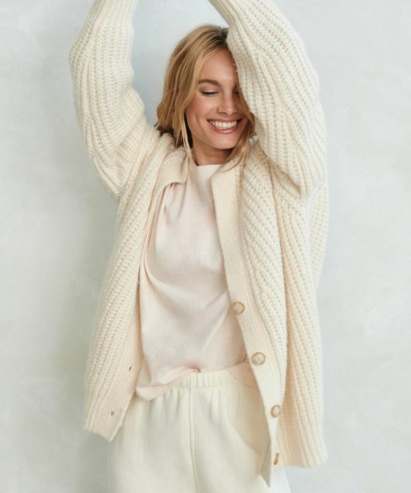 This ultra-lightweight, chunky knit has the same stitch as our coveted Cashmere Cocoon Cardigan, but boasts an airy look and feel that’s primed for the season. As our fluffiest rendition yet, this rustic take on the Cocoon silhouette is one you’ll wear with everything. 70% baby alpaca, 23% polyamide, 7% merino wool. Faux-horn buttons.