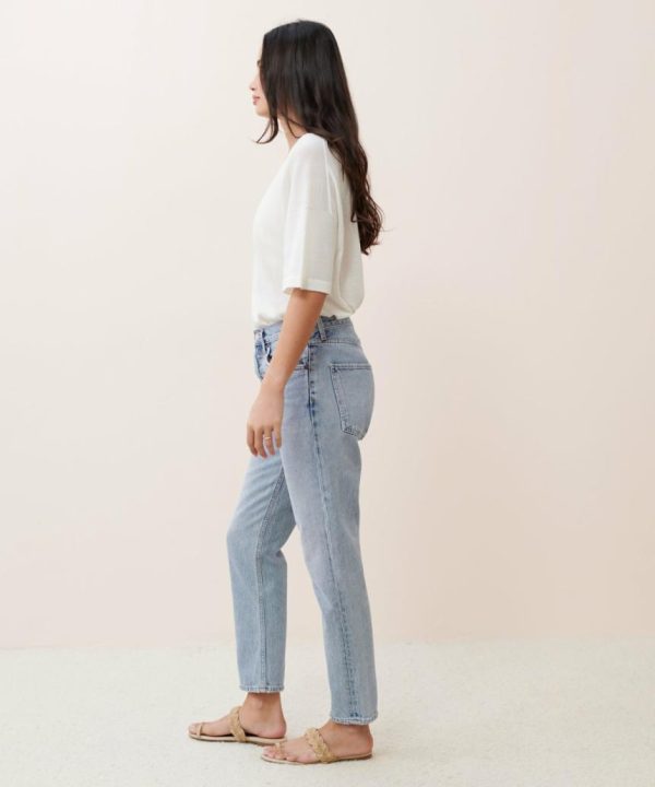 High rise jean with straight leg, cropped length, and button fly. Crafted from stretch denim with a 26″ inseam.
