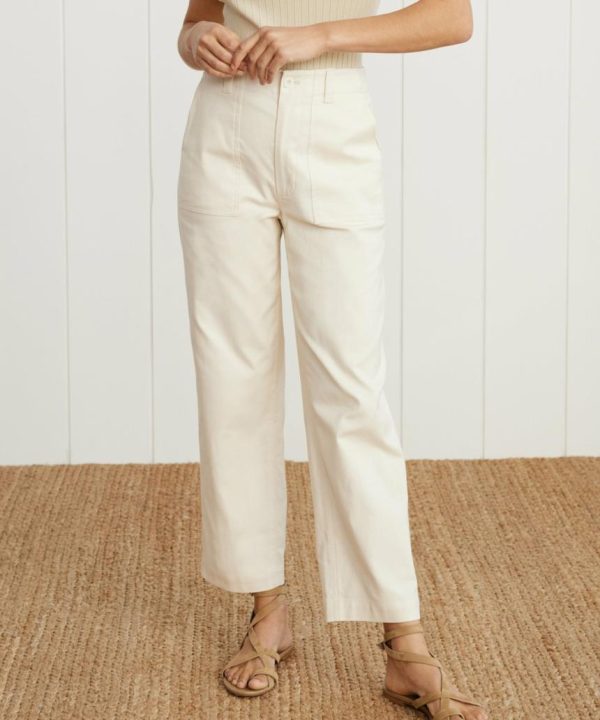 Straight leg army pant with front zipper, back pockets, and slightly cropped inseam.